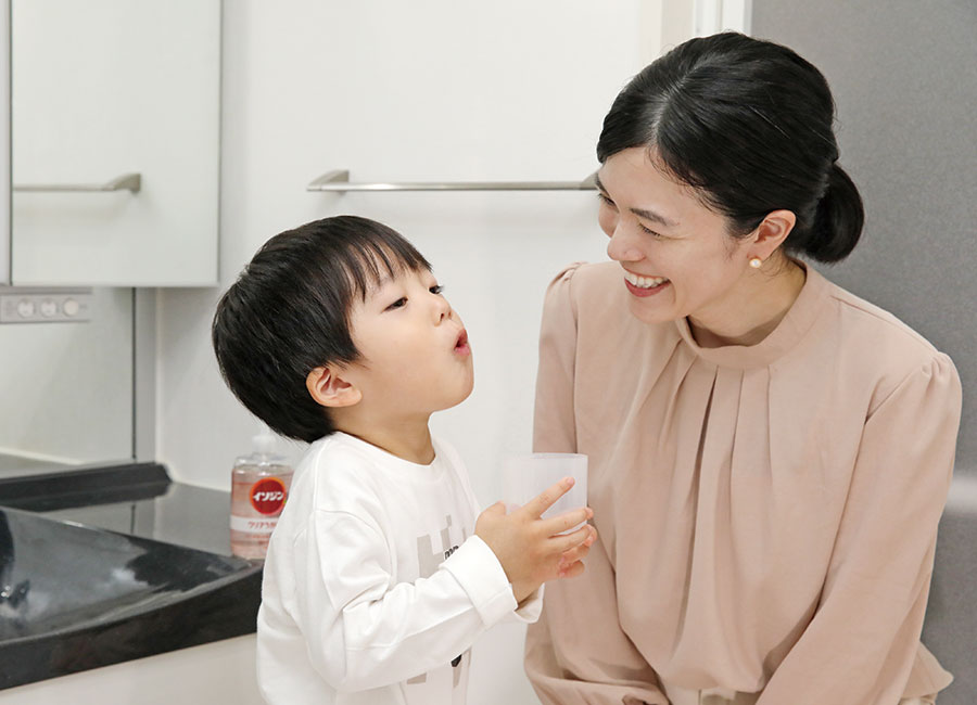 「私自身がウイルスに弱いこともあるので、祐翔も含め家族みんなでうがいは習慣化させています」と話す、2人の子どもを育てるママの坪井亜美さん。長男の祐翔くんもしばらくは水でうがいをしていましたが、今年から入園となり、ウイルス対策を考えていたそう。「イソジン®クリアうがい薬アップル風味」を試したところ、今では帰宅後、自ら洗面所に行きママと一緒にうがい液を作るようになりました。「自分で作りたい!と言われたときは大丈夫かな?と心配したのですが、ボトルに重量感があるので、子どもでもプッシュできました」と話すように、安定感のあるボトルは子どもと一緒に使いやすいポイントです。