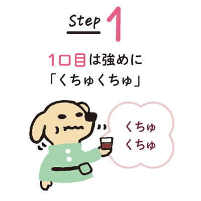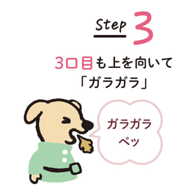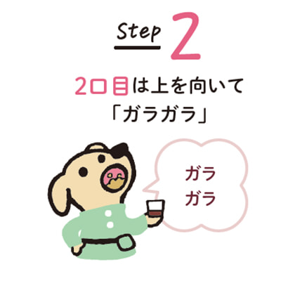 1口目は口の中でくちゅくちゅして「ペッ」。2口目、3口目は、上を向いて「ガラガラ」とうがいをして、吐き出します。どのステップも大体15秒ずつが目安です。