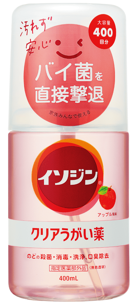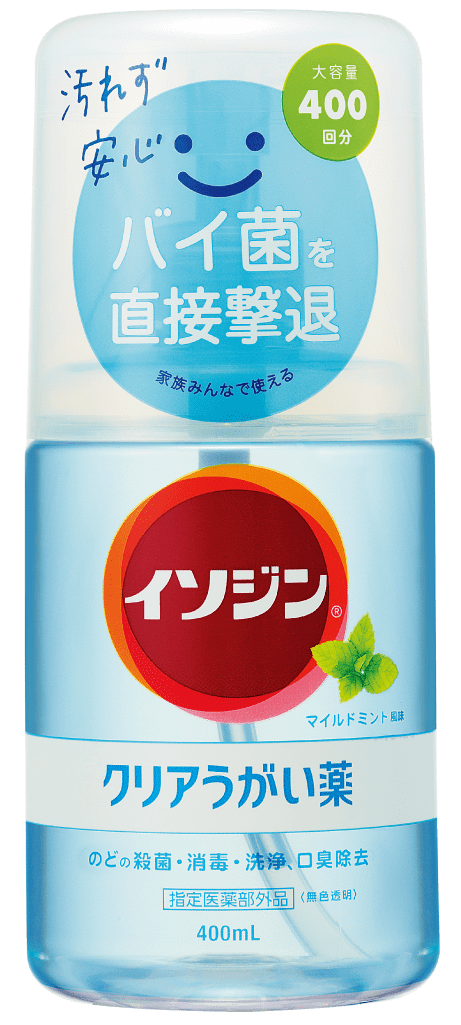 「イソジン®クリアうがい薬」は、家族みんなの毎日のうがい習慣にオススメ。茶色のヨード液のような色や苦味がなく、透明でさわやかな風味が特長。低刺激ながら殺菌成分と抗炎症成分がダブルで配合され、のどに炎症を起こす細菌を撃退します。殺菌成分CPC(※)には口臭の原因菌を殺菌する効果も期待できます。